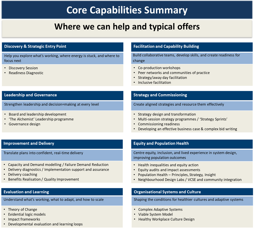 From there, the work develops collaboratively, shaped by the organisation’s context and drawing on the capabilities below as things become clearer.