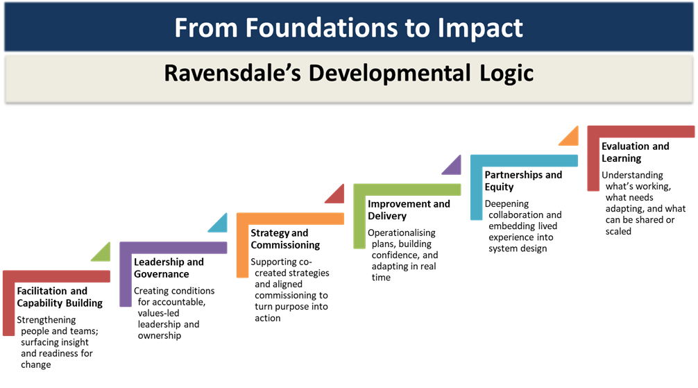 Each stage builds confidence and capability — from discovery and facilitation through leadership, commissioning and delivery to evaluation and learning.